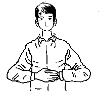 Coloque o polegar de sua mão esquerda no meio da palma, faça um punho diante do peito e cubra com a outra mão, colocando o polegar da mão direita sobre a mão esquerda. Os antebraços fazem uma linha reta, com os ombros um pouco distantes do corpo. |